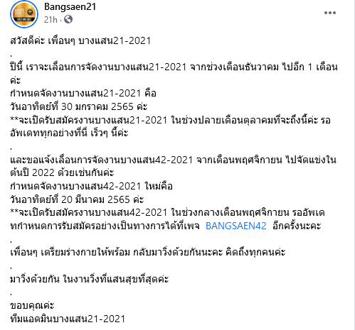 เลื่อนเรียบร้อย โดยงานบางแสน21 จะจัดวันที่ 30 มกราคม 2565 และ บางแสน42 จะจัดวันที่ 20 มีนาคม 2565